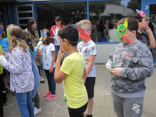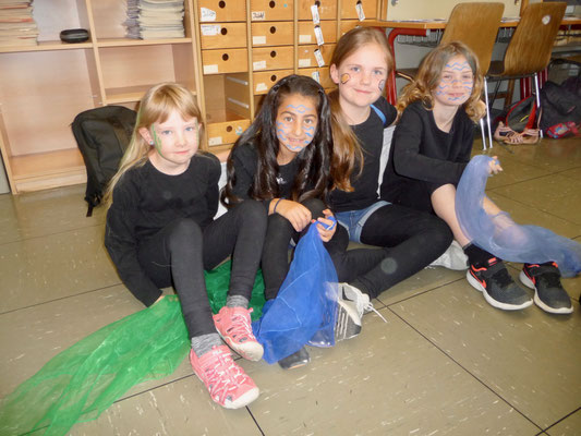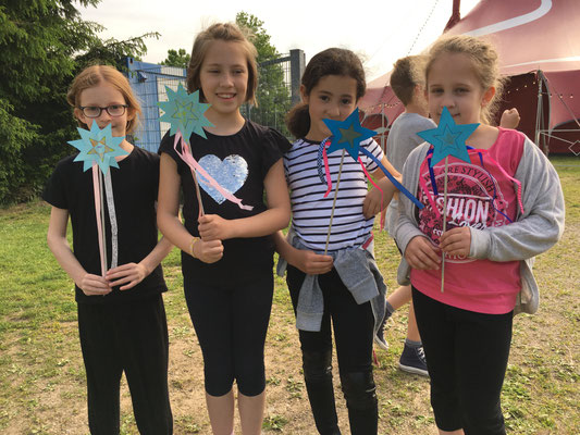 … drehte sich selbstverständlich auch alles um unser Projektthema. Hoch motiviert bastelten die Kinder Zirkuswaagen, tobten sich mit Kreide auf dem Schulhof aus, gestalteten bunte und glitzernde Masken und Zauberstäbe oder genossen draußen einfach nur das zauber-hafte Wetter.
